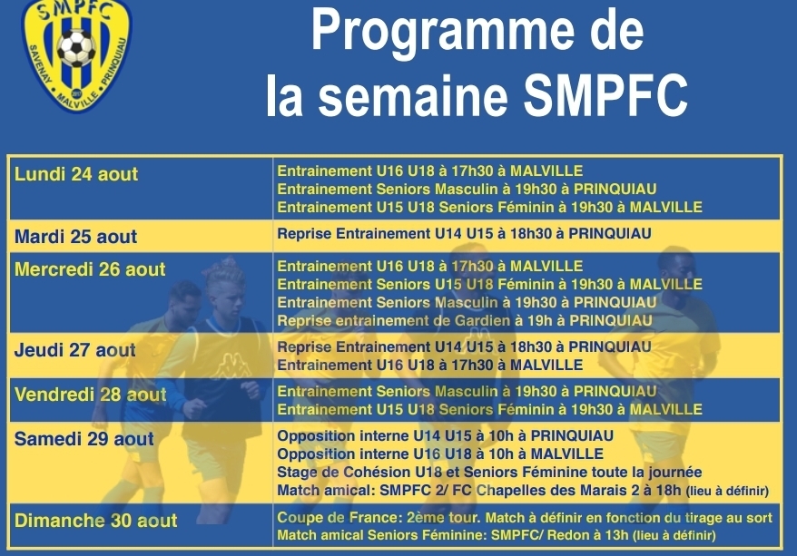Retrouvez le programme des entrainements et du week end pour cette semaine Notons la reprise des entrainements pour les U14 U15 et pour les gardiens de but Bonne semaine à tous